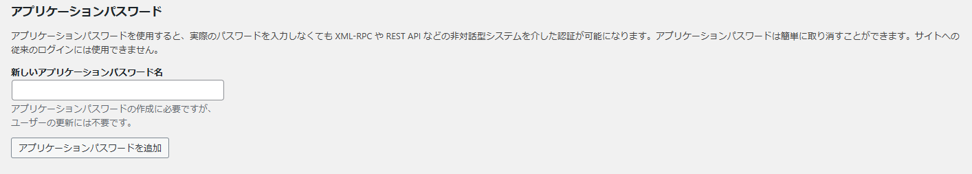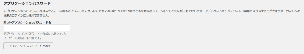 管理画面のサイドバーで、ユーザー>プロフィールと進み、下部のアプリケーションパスワードのところから発行します。名称はなんでもいいですが、あとから何だっけこれとなるのでわかりやすい名前が良いと思います。