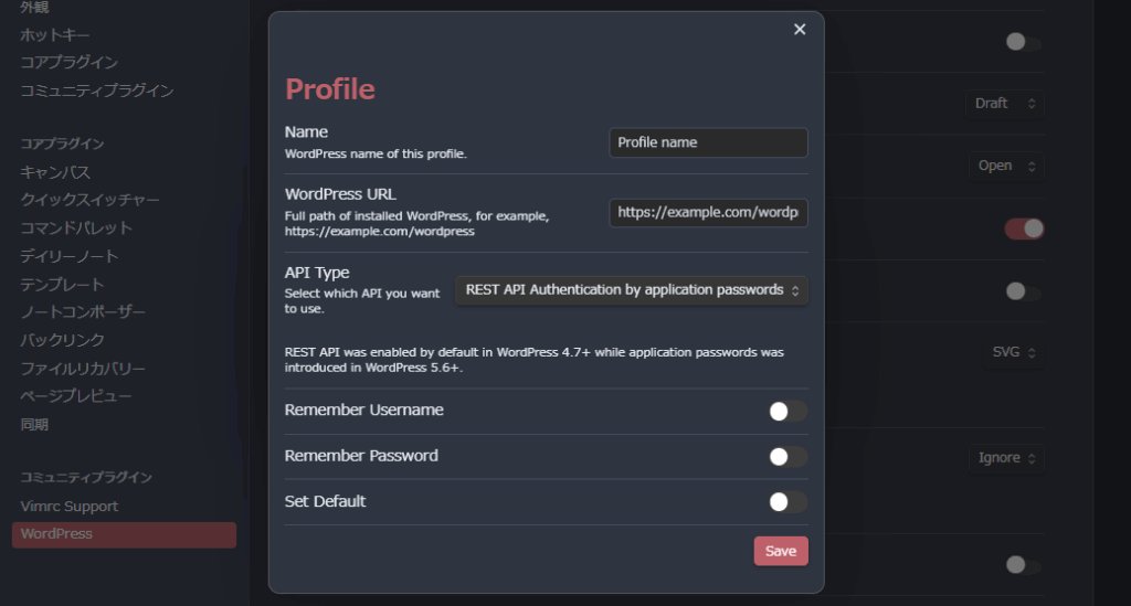 WordPress URLはブログのドメイン(たとえばこのブログならhttps://obsidiantips.com/)を入れます。Username, Passwordを都度入力するのが面倒なら、記憶させることもできます。UsernameはWordPressのid(あとから変えられないやつです)、Passwordは、先程発行させたアプリケーションパスワードです。